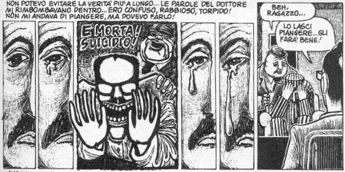Questa graphic dell’Einaudi è uscita nel duemila e oltre, e raccoglie due graphic. I capitoli sono usciti a puntate non ricordo dove. Ed è un fatto di quanto non sia stata presa in considerazione – nonostante il Pulitzer – dall’editoria. Tra l’altro, è un insieme di due libri, ed è stata scritta da Spiegelman in parecchi anni, con visite a suo padre mentre il padre invecchiava (e peggiorava). Questo lungo tempo di scrittura, secondo me, si sente. C’è sia una evoluzione (di segno e di testo) e sia uno staccamento, tra le prime strisce e le ultime. Abbastanza normale, direi. Poi, se dovete comprarlo, sono 21euro per 281 pagine. Per tutto quello che c’è dentro è un ottimo, ottimo prezzo. Poi… è pieno i idee e invenzioni fumettistiche, che vanno ben al di là del contenuto. Anche qui torno a Primo Levi. Nel senso che Levi è uno scrittore magnifico (i racconti, diocristo, i racconti!) tra i più abili italiani di sempre, e un dio del Novecento letterario. Ma non riesce ad avere questa fama e riconoscimento perché lo si continua a incasellare nello slot “Olocausto” e tutto quello che è fuori (persino La tregua, che è tanto quanto il precedente, finisce fuori). Ecco, idem per Art Spiegelman, che è un fumettista galattico. Per dire solo una cosa, dentro il fumetto c’è un fumetto, che lui aveva disegnato, ed è diverso, per segno e stile, ed è una gran trovata. (Prigioniero sul pianeta Inferno) si chiama. Vediamo se trovo una striscia che ve la metto qua…