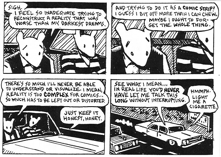 - Ecco. I poveri ebrei sono topi. I tedesci gatti, eccetera. ma non limitatevi alla trasposizione animale, anche se è davvero un colpo di genio maleficissimo. Guardate, se volete, il segno, il modo come con pochissimo dia emotività ed espressioni a tutti i personaggi in ogni tavola. Io lo trovo bravissimo, Artie Spiegelman. Tipo ecco, vi metto un tavola a caso, sempre coi topi…
