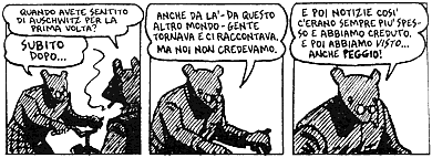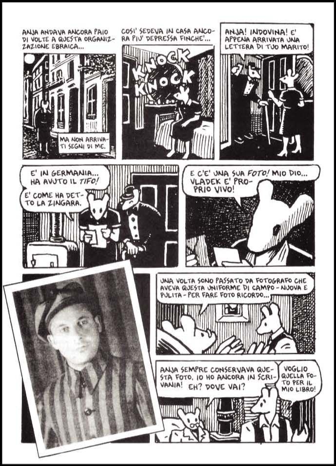 - E poi, c’è anche la cosa dell’Olocausto, certo. Ti rendi conto di come stavano le cose e del perché molti non sono fuggiti, non sono riusciti a capire quello che stava succedendo o non ci hanno creduto. La testimonianza di Vladek e il suo comportamento paranoico e folle hanno valore indipendentemente dalla storia recuperata. Vladek è comunque un protagonista controverso, per chi legge il lavoro. Non è un super eroe, ma a modo suo è qualcosa di unico, degno di ammirazione o, a tratti, fastidio. Insomma… è un lavoro apprezzabile anche come gestione dell”eroe, che non si capisce bene chi sia, tolto Vladek.